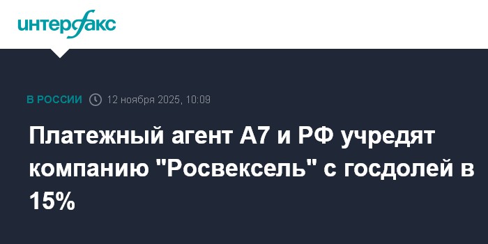 Платежный агент А7 и РФ учредят компанию "Росвексель" с госдолей в 15%