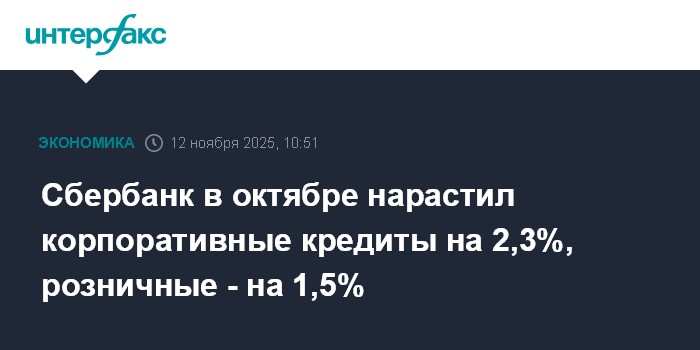 Москва. 12 ноября. INTERFAX.RU - Сбербанк в октябре нарастил корпоративное кредитование по РСБУ на 2,3% (после роста на 3,2% в сентябре), сказано в отчетности банка.