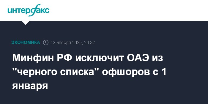 Москва. 12 ноября. INTERFAX.RU - Минфин РФ подготовил проект приказа, исключающий Объединенные Арабские Эмираты (ОАЭ) из перечня офшоров с 1 января 2026 года.