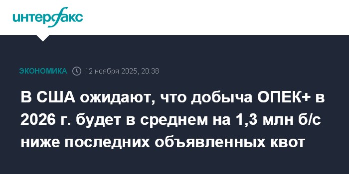 В США ожидают, что добыча ОПЕК+ в 2026 г. будет в среднем на 1,3 млн б/с ниже последних объявленных квот
