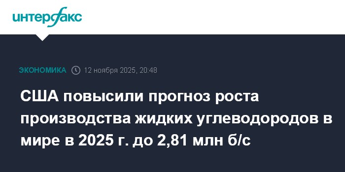 Москва. 12 ноября. INTERFAX.RU - Мировое производство жидких углеводородов (ЖУВ) в 2025 году увеличится на 2,81 млн баррелей в сутки (б/с) и составит 105,98 млн б/с, сообщается в отчете управления энергетической информации Минэнерго США (EIA).