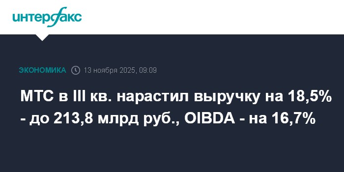 Москва. 13 ноября. INTERFAX.RU - Выручка ПАО "МТС" в III квартале 2025 года выросла на 18,5% - до 213,8 млрд рублей, сообщила компания.