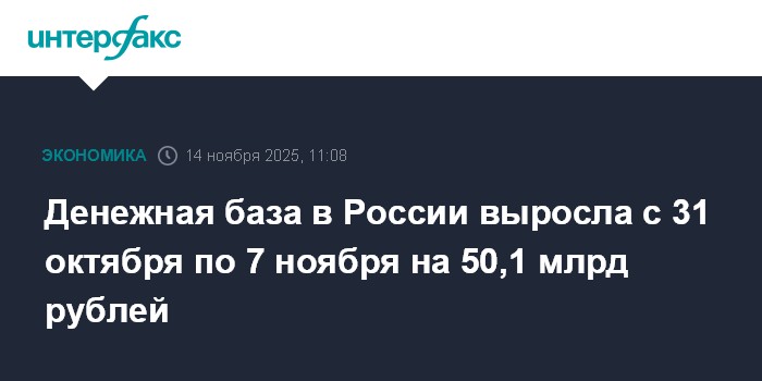 Денежная база в России выросла с 31 октября по 7 ноября на 50,1 млрд рублей