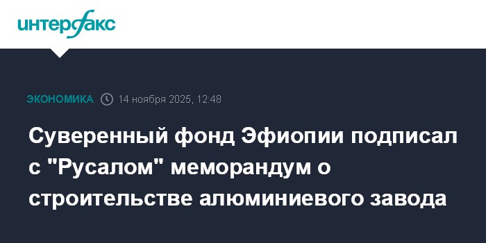 Москва. 14 ноября. INTERFAX.RU - Суверенный фонд Эфиопии Ethiopian Investment Holdings подписал меморандум о взаимопонимании с "Русалом" о строительстве алюминиевого завода в этой стране, сообщила Ethiopian Investment в пятницу.