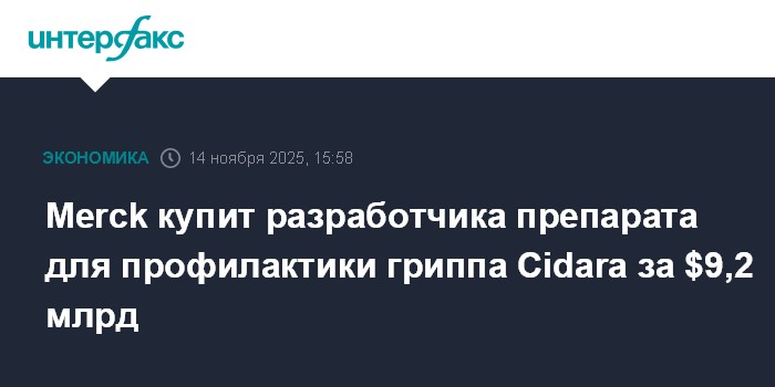 Москва. 14 ноября. INTERFAX.RU - Американская фармацевтическая компания Merck & Co. покупает разработчика экспериментального препарата для профилактики гриппа Cidara Therapeutics Inc. за $9,2 млрд.