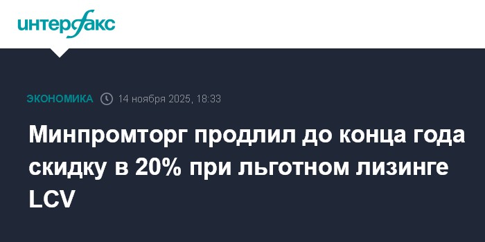 Москва. 14 ноября. INTERFAX.RU - Увеличенная 20-процентная скидка на легкие коммерческие автомобили (LCV) в рамках программы льготного лизинга продлена до конца 2025 года, сообщили в пресс-службе Минпромторга.