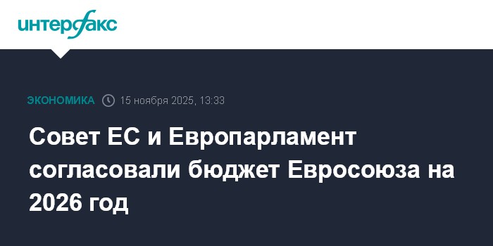 Москва. 15 ноября. INTERFAX.RU - Совет ЕС объявил в субботу, что согласовал с Европейским парламентом бюджет Евросоюза на 2026 год на 192,8 млрд евро.