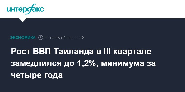Москва. 17 ноября. INTERFAX.RU - Экономика Таиланда в третьем квартале 2025 года увеличилась на 1,2% в годовом выражении, говорится в отчете министерства экономики и социального развития страны.