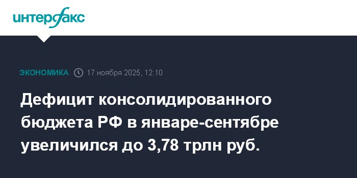Дефицит консолидированного бюджета РФ в январе-сентябре увеличился до 3,78 трлн руб.