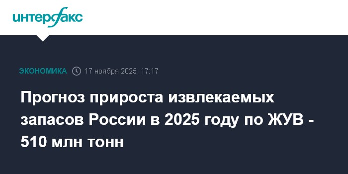 Прогноз прироста извлекаемых запасов России в 2025 году по ЖУВ - 510 млн тонн