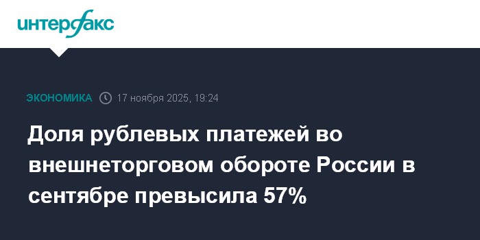 Москва. 17 ноября. INTERFAX.RU - Доля платежей в российских рублях во внешнеторговых расчетах России в сентябре 2025 года вновь обновила максимум, достигнув 57,4% после 55,4% в августе и 54,9% в июле, следует из расчетов на основании предварительных данных о валютной структуре внешнеторговых расчетов, опубликованных на сайте Банка России.