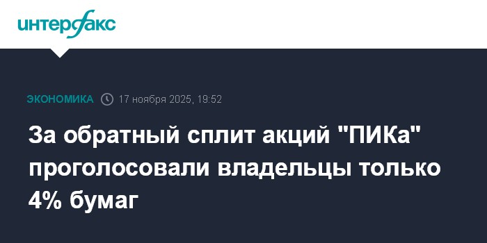 Москва. 17 ноября. INTERFAX.RU - Девелопер "ПИК" раскрыл результаты голосования по вопросу об обратном сплите: участие в собрании приняли владельцы 57,8% акций, из них всего 7% проголосовали за. То есть в общей сложности владельцы всего 4,1% акций высказались в поддержку инициативы.