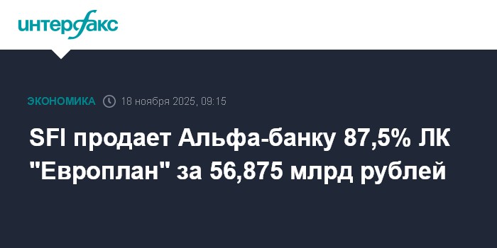 SFI продает Альфа-банку 87,5% ЛК "Европлан" за 56,875 млрд рублей