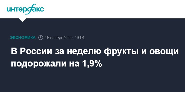 Москва. 19 ноября. INTERFAX.RU - В России с 11 по 17 ноября плодоовощная продукция подорожала на 1,9%, сообщил Росстат. С 6 по 10 ноября цены выросли на 1,7%.