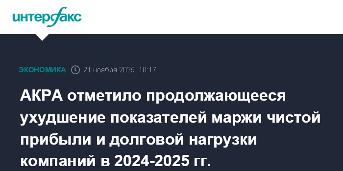 АКРА отметило продолжающееся ухудшение показателей маржи чистой прибыли и долговой нагрузки компаний в 2024-2025 гг.