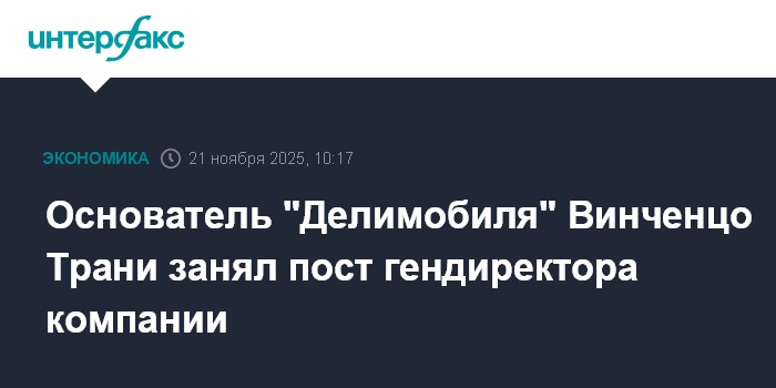 Москва. 21 ноября. INTERFAX.RU - Винченцо Трани - основатель и ключевой акционер ПАО "Каршеринг Руссия" (бренд "Делимобиль") - с 21 ноября занял пост гендиректора компании. Как говорится в релизе "Делимобиля", решение принято советом директоров на заседании в четверг.