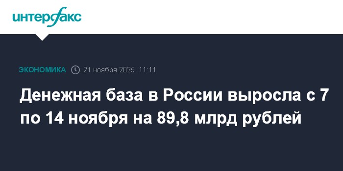 На 7 ноября денежная база в России равнялась 19043,1 млрд рублей. Таким образом, за период она выросла на 0,47%, или на 89,8 млрд рублей.