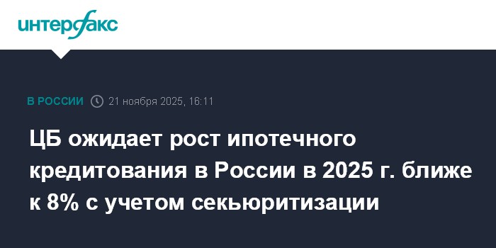 Москва. 21 ноября. INTERFAX.RU - Рост ипотечного кредитования в России в 2025 году будет ближе к верхней границе прогноза 5-8% с исключением эффекта сделок секьюритизации (3-6% без исключения), говорится в аналитическом обзоре ЦБ по банковскому сектору.