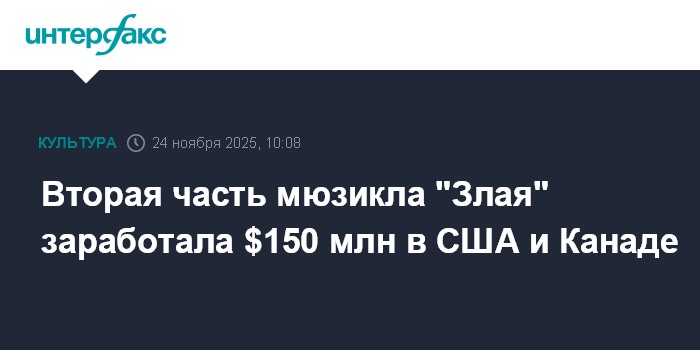 Москва. 24 ноября. INTERFAX.RU - Вторая часть экранизации известного бродвейского мюзикла "Злая" (Wicked) заработала $150 млн в кинотеатрах США и Канады в первые выходные проката, пишет The Wall Street Journal.