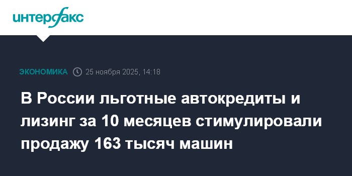 Москва. 25 ноября. INTERFAX.RU - В России за десять месяцев 2025 года продано более 163 тысяч автомобилей за счет программ льготного автокредитования и автолизинга, сообщил замглавы Минпромторга Альберт Каримов на круглом столе в Совете Федерации.