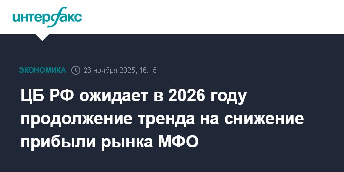 Москва. 26 ноября. INTERFAX.RU - Банк России ожидает сохранения тренда на снижение чистой прибыли микрофинансовых организаций (МФО) в 2026 году, сообщил заместитель директора департамента небанковского кредитования ЦБ РФ Никита Акимов журналистам в среду.