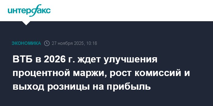 ВТБ в 2026 г. ждет улучшения процентной маржи, рост комиссий и выход розницы на прибыль