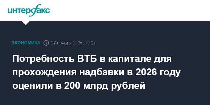 Москва. 27 ноября. INTERFAX.RU - ВТБ оценивает потребность в дополнительном капитале на 2026 год в 200 млрд рублей для соблюдения норматива достаточности капитала с учетом восстановления Базельских надбавок к нормативам достаточности капитала, заявил "Интерфаксу" первый зампред ВТБ Дмитрий Пьянов в преддверии форума "Россия зовет!".