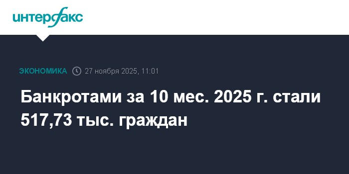 Банкротами за 10 мес. 2025 г. стали 517,73 тыс. граждан
