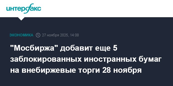 Москва. 27 ноября. INTERFAX.RU - "Московская биржа" сообщила, что 28 ноября добавит еще пять иностранных ценных бумаг в список доступных для заключения внебиржевых сделок с расчетами через центрального контрагента (ЦК).