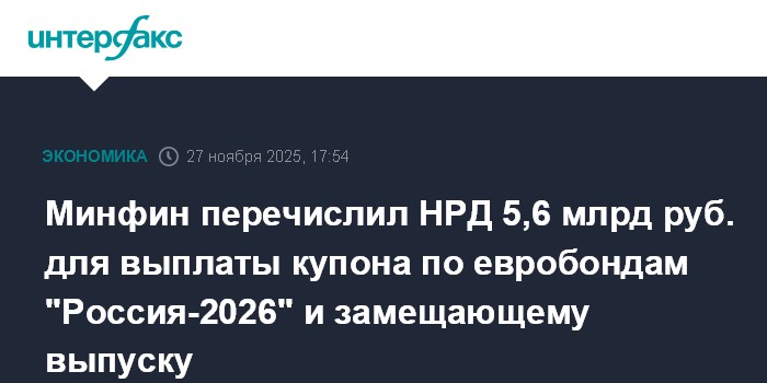 Минфин перечислил НРД 5,6 млрд руб. для выплаты купона по евробондам "Россия-2026" и замещающему выпуску