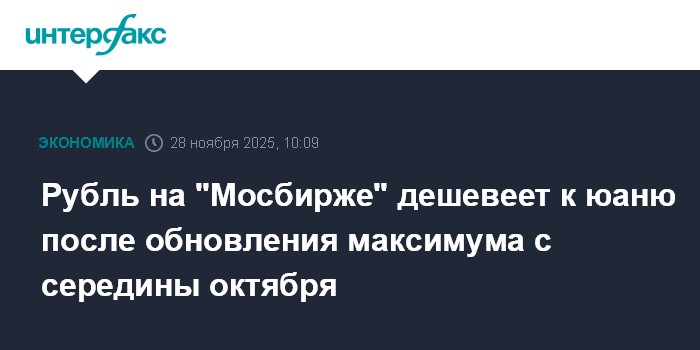 Рубль на "Мосбирже" дешевеет к юаню после обновления максимума с середины октября