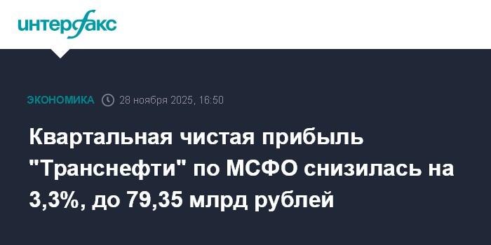 Москва. 28 ноября. INTERFAX.RU - Чистая прибыль "Транснефти") в третьем квартале 2025 года составила 79,35 млрд рублей, что на 3,3% меньше, чем годом ранее, говорится в отчете компании.