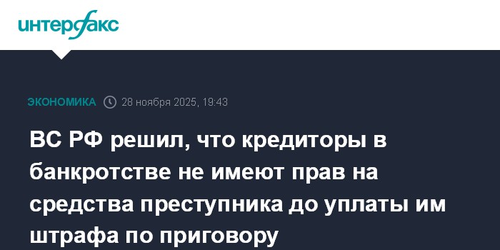 ВС РФ решил, что кредиторы в банкротстве не имеют прав на средства преступника до уплаты им штрафа по приговору