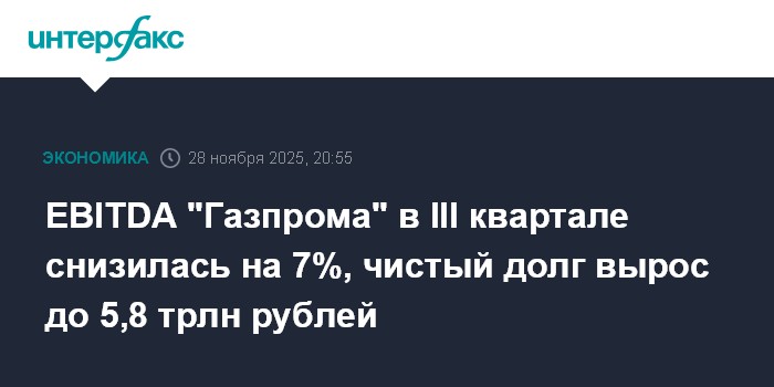 Москва. 28 ноября. INTERFAX.RU - EBITDA "Газпрома" в третьем квартале 2025 года составила почти 635 млрд рублей, что на 6,9% меньше результата за аналогичный период годом ранее, следует из отчетности эмитента.
