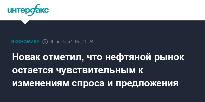 Москва. 30 ноября. INTERFAX.RU - Нефтяной рынок остается чувствительным к изменениям спроса и предложения, роль ОПЕК+ сохраняет критическую значимость для мировой энергобезопасности и долгосрочных инвестиций, заявил в ходе встреч ОПЕК+ вице-премьер РФ Александр Новак.
