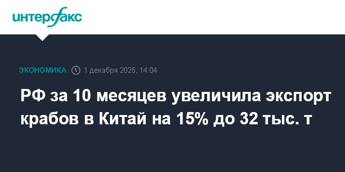 "Динамика крабового экспорта отражает ситуацию с российской добычей: за 10 месяцев 2025 года добыто около 76 тыс. тонн крабов, что на 12% больше к сопоставимому периоду 2024 года. На этом фоне поставки живых крабов из Канады в Китай сократились на 30%, до 5 тыс. тонн", - говорится в сообщении.