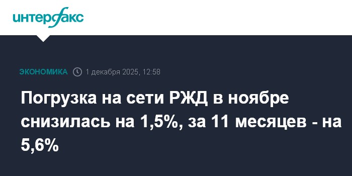 Москва. 1 декабря. INTERFAX.RU - Погрузка на сети ОАО "Российские железные дороги" в ноябре 2025 г., согласно оперативной информации, составила 94,2 млн тонн, что на 1,5% меньше, чем за аналогичный период прошлого года, сообщила компания