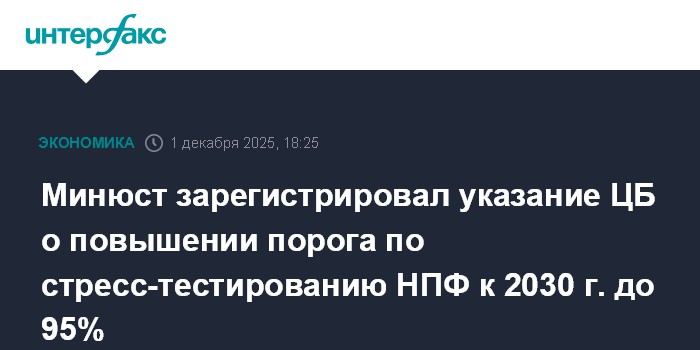 Москва. 1 декабря. INTERFAX.RU - Минюст зарегистрировал указание Банка России о постепенном повышении порога успешного прохождения стресс-тестирования для негосударственных пенсионных фондов (НПФ) с 75% до 95% к 1 января 2030 года. Соответствующий документ опубликован на сайте регулятора.