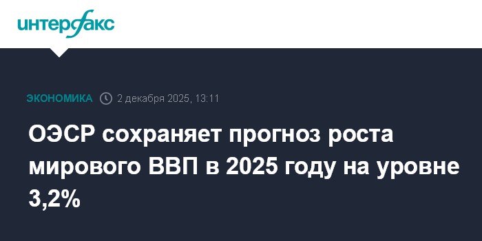 Москва. 2 декабря. INTERFAX.RU - Организация экономического сотрудничества и развития (ОЭСР) подтвердила прогнозы роста мирового ВВП на 2025 и 2026 годы, отметив устойчивость глобальной экономики, несмотря на повышение торговых барьеров и политическую неопределенность.