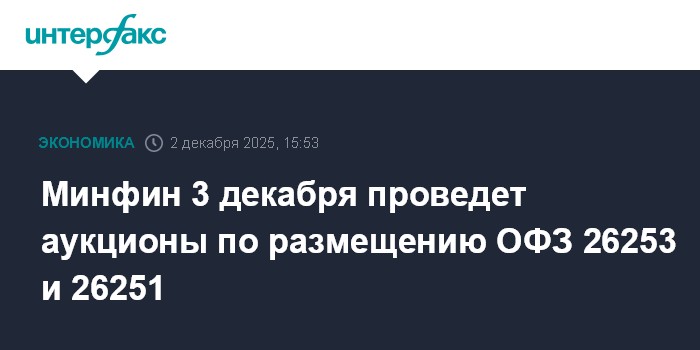 Минфин 3 декабря проведет аукционы по размещению ОФЗ 26253 и 26251