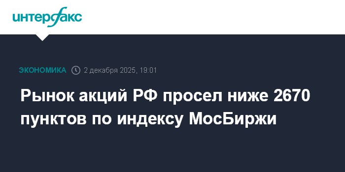 Москва. 2 декабря. INTERFAX.RU - Рынок акций РФ завершил основные торги во вторник снижением после заявлений президента РФ Владимира Путина относительно участия Европы в мирном урегулировании конфликта вокруг Украины, инвесторы также ожидают итогов встречи Путина и спецпосланника США Стива Уиткоффа. Индекс МосБиржи опустился ниже 2670 пунктов на фоне очередного укрепления рубля.