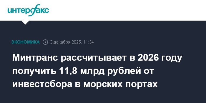 Москва. 3 декабря. INTERFAX.RU - Поступления от портового инвестиционного сбора на строительство и реконструкцию объектов инфраструктуры морских портов в 2026 году могут составить 11,84 млрд рублей, следует из проекта приказа Министерства транспорта, опубликованного на официальном портале проектов нормативных правовых актов.