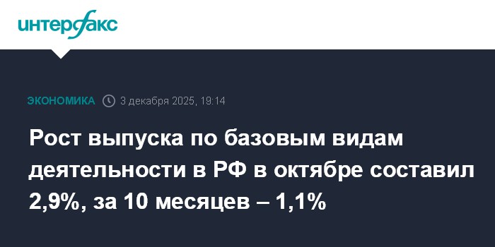 Рост выпуска по базовым видам деятельности в РФ в октябре составил 2,9%, за 10 месяцев – 1,1%