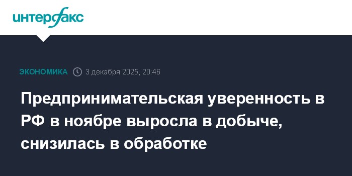 Москва. 3 декабря. INTERFAX.RU - Индекс предпринимательской уверенности в добывающих отраслях РФ в ноябре 2025 года вырос на 0,4 процентного пункта (п.п.) до минус 1,7%, сообщил Росстат в среду.