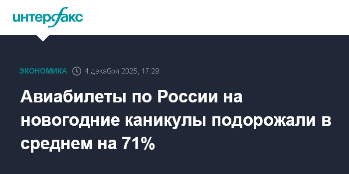 Москва. 4 декабря. INTERFAX.RU - Стоимость авиабилетов по России с вылетом 1 января выросла на 71% по сравнению с аналогичным периодом прошлого года, на большинстве популярных туристических направлений перелеты обойдутся дороже в 1,5-3 раза, сообщает Ассоциация туроператоров России (АТОР) в четверг.