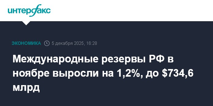 Москва. 5 декабря. INTERFAX.RU - Объем международных (золотовалютных) резервов РФ в ноябре 2025 года увеличился на $8,747 млрд, или на 1,2%, до $734,588 млрд с $725,841 млрд, согласно информации на сайте ЦБ РФ.