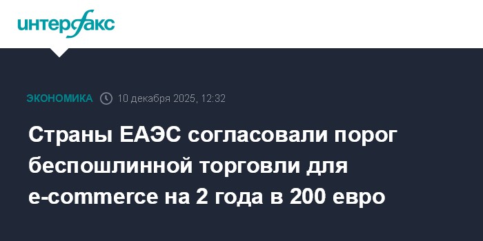 Москва. 10 декабря. INTERFAX.RU - Страны-участницы Евразийского экономического союза (ЕАЭС) договорились о сохранении минимум на два года порога беспошлинного ввоза товаров, приобретаемых физическими лицами через маркетплейсы, на уровне 200 евро.