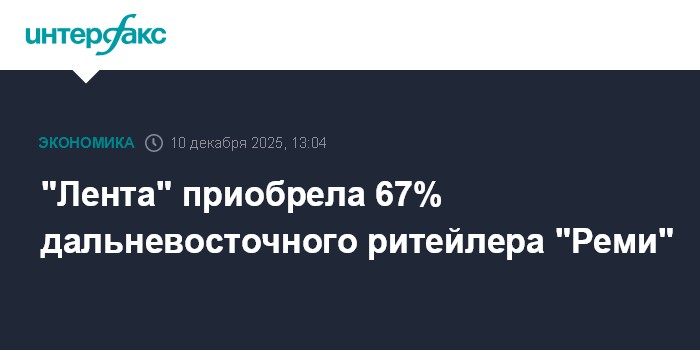 Москва. 10 декабря. INTERFAX.RU - МКПАО "Лента" сообщила о приобретении 67% долей ГК "Реми", которая объединяет супермаркеты, гипермаркеты, магазины у дома и дискаунтеры на Дальнем Востоке.