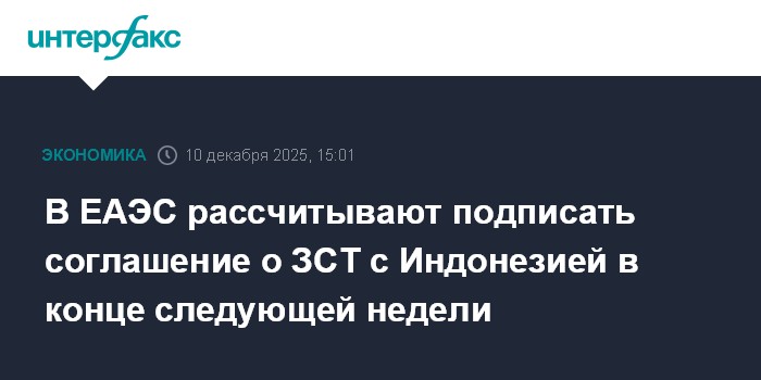 Москва. 10 декабря. INTERFAX.RU - Страны Евразийского экономического союза (ЕАЭС) пока продолжают внутригосударственные процедуры по подготовке к подписанию соглашения о зоне свободной торговли с Индонезией, по-прежнему ожидается, что документ может быть подписан на заседании Высшего Евразийского экономического совета (ВЕЭС) в конце следующей недели.