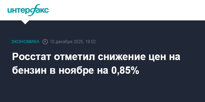 Москва. 10 декабря. INTERFAX.RU - Потребительские цены на бензин в России в ноябре 2025 года впервые за долгое время перешли к снижению, сократившись относительно предыдущего месяца на 0,85% после увеличения на 2,63% в октябре, на 2,58% в сентябре, на 1,81% в августе, на 1,37% в июле и на 0,66% в июне, сообщил в пятницу Росстат.